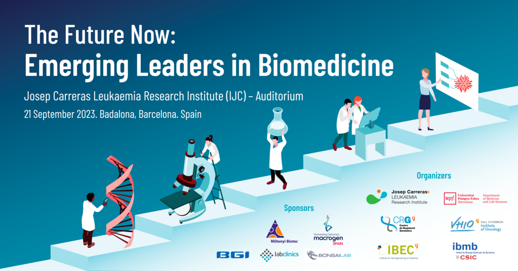 We are delighted to announce the first edition of the symposium "The Future Now: Emerging Leaders in Biomedicine".  This event is specifically tailored for advanced postdoctoral researchers and junior Group Leaders who are at the forefront of the vibrant biomedical community of the Barcelona area. Join us at the Josep Carreras Leukaemia Research Institute (IJC) on September 21, 2023. This Symposium is co-organized by the Josep Carreras Leukaemia Research Institute (IJC), the Vall d'Hebrón Institute of Oncology (VHIO), the Institute for Bioengineering of Catalonia (IBEC),the Institute of Molecular Biology of Barcelona (IBMB), the Centre for Genomic Regulation (CRG) and the University Pompeu Fabra, Department of Medicine and Life Science.